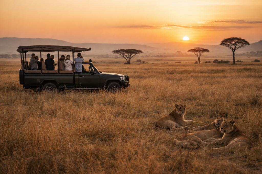 You wake up early. The air is cool. The jeep enters the reserve as the sun rises. You may see lions resting, giraffes walking, and herds of wildebeest crossing the plains.