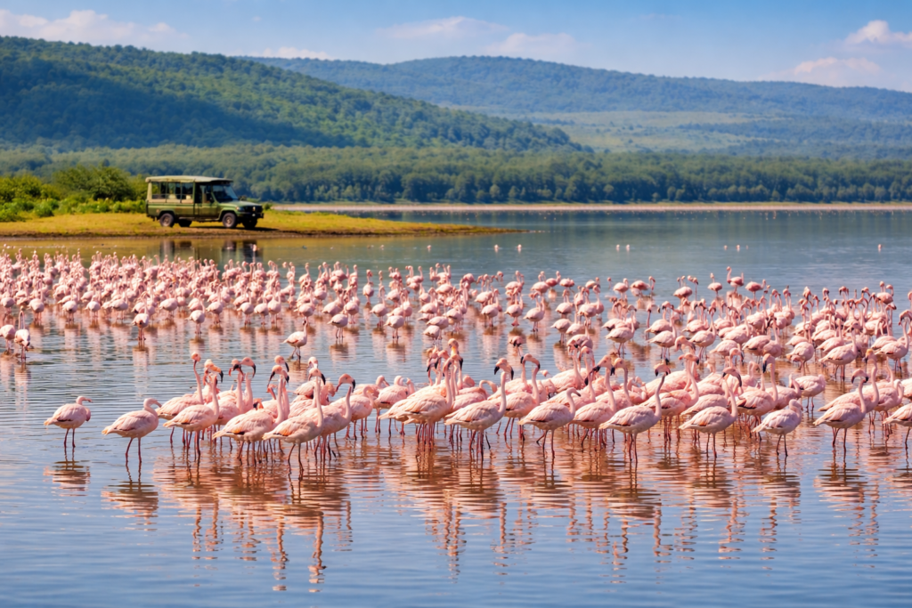 Lake Nakuru is known for flamingos and rhinos. It adds variety to the safari experience.